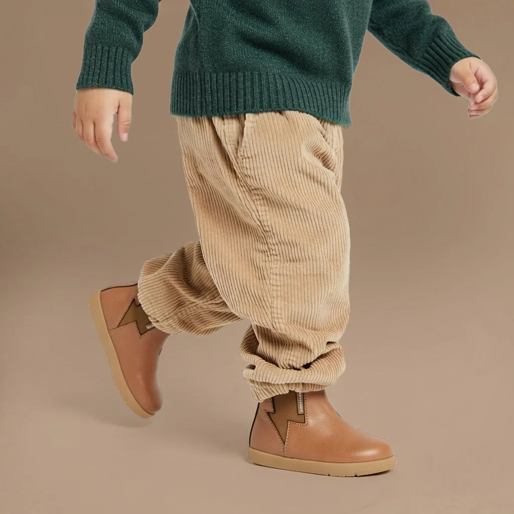 The Bolt Boot by Pretty Brave is designed for little movers gaining confidence on their feet. Crafted from genuine leather with a breathable lining, padded ankle, and flexible rubber sole, the Bolt combines comfort with playful style.
