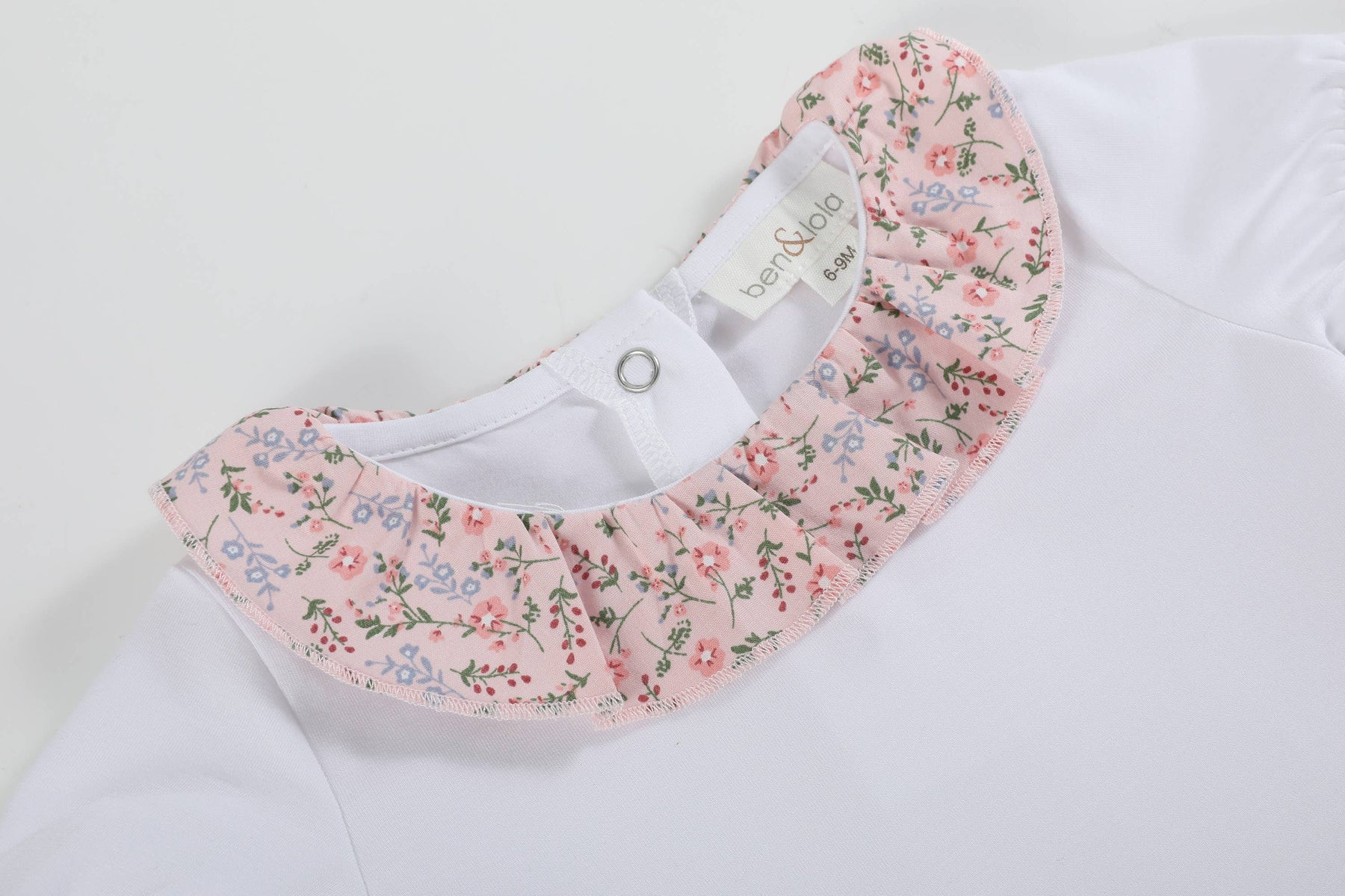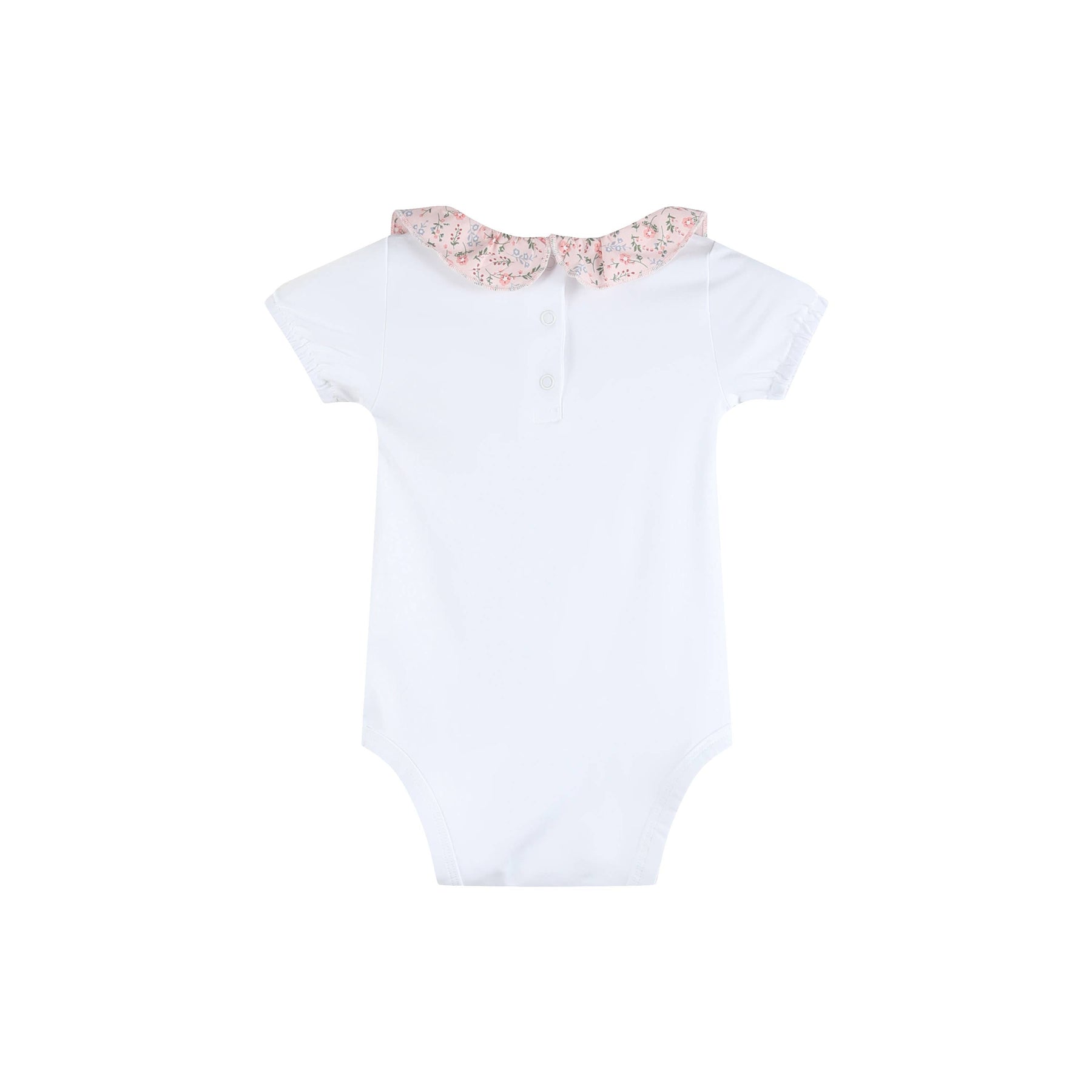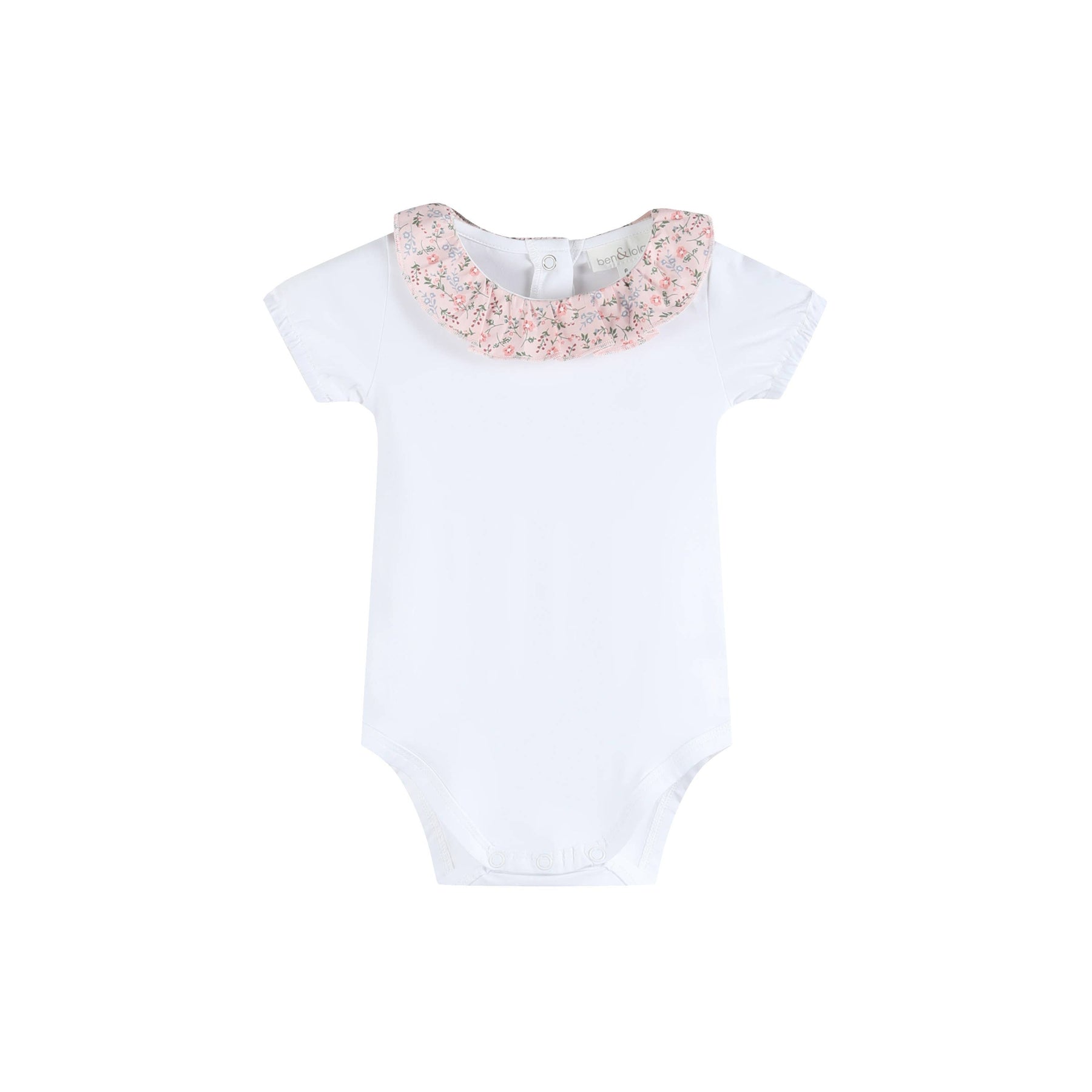 This sweet baby bodysuit features a delicate frill collar, beautifully finished in a soft floral fabric for a gentle statement.