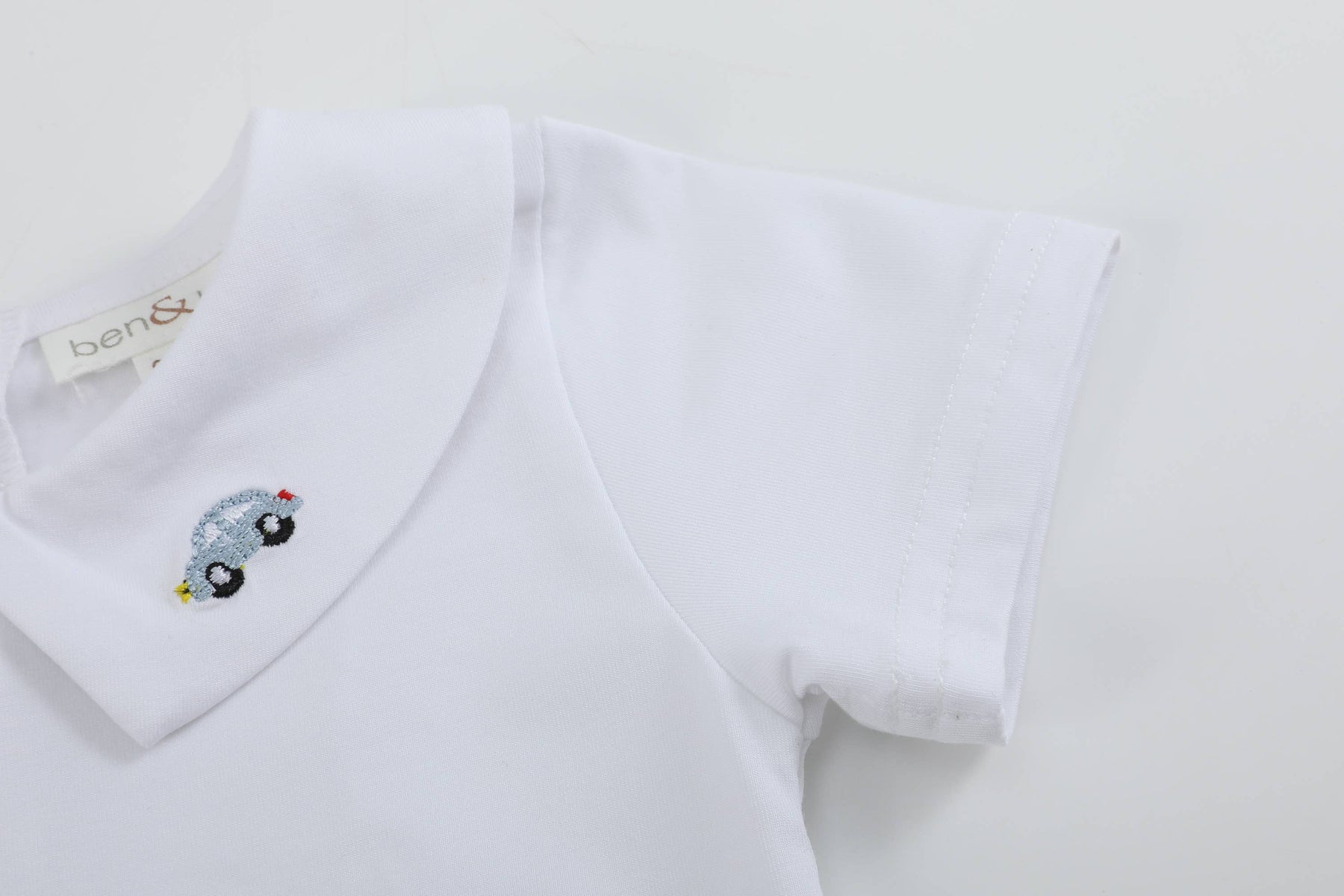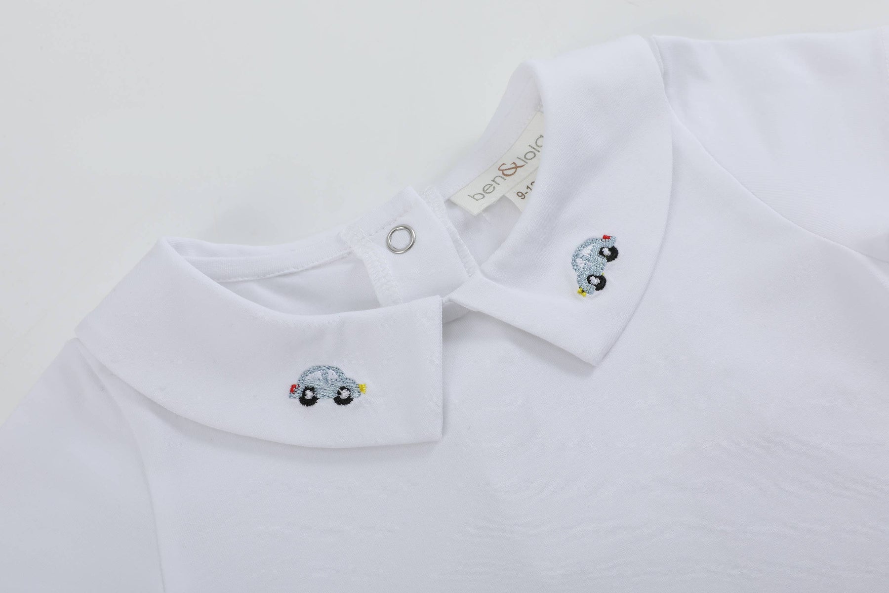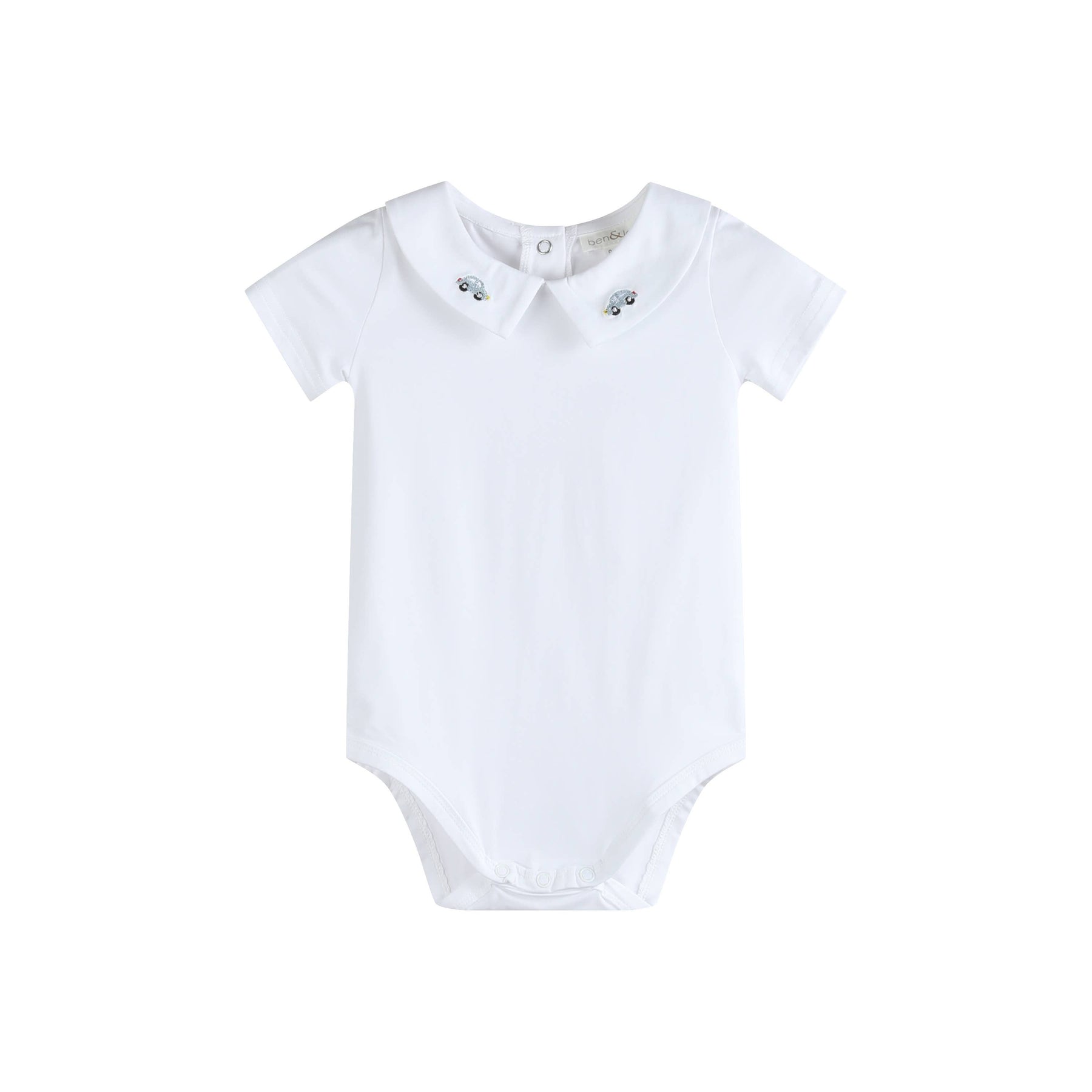 This adorable baby bodysuit features a charming collar, delicately detailed with embroidered cars for a playful yet timeless touch.